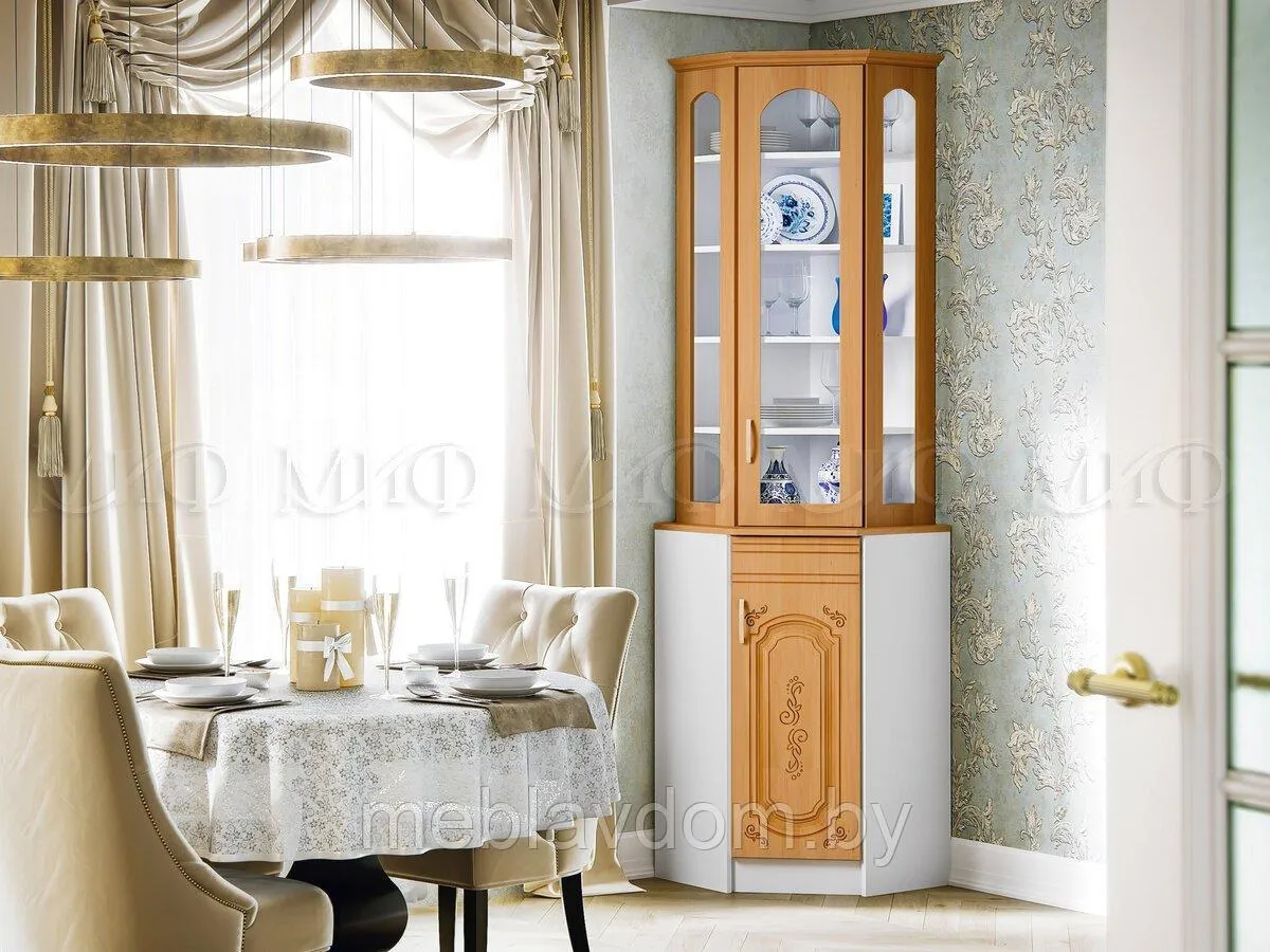 Угловой сервант Лиза-2 - это функциональное и аутентичное место для хранения посуды. Несмотря на свои небольшие размеры, в нем отлично разместятся все необходимые в быту тарелки, чашки и столовые приборы. Буфет разделен на три зоны хранения: в витринной части можно выставить необычные и нарядные блюда и бокалы. За распашными дверцами можно разместить более габаритные кухонные принадлежности.